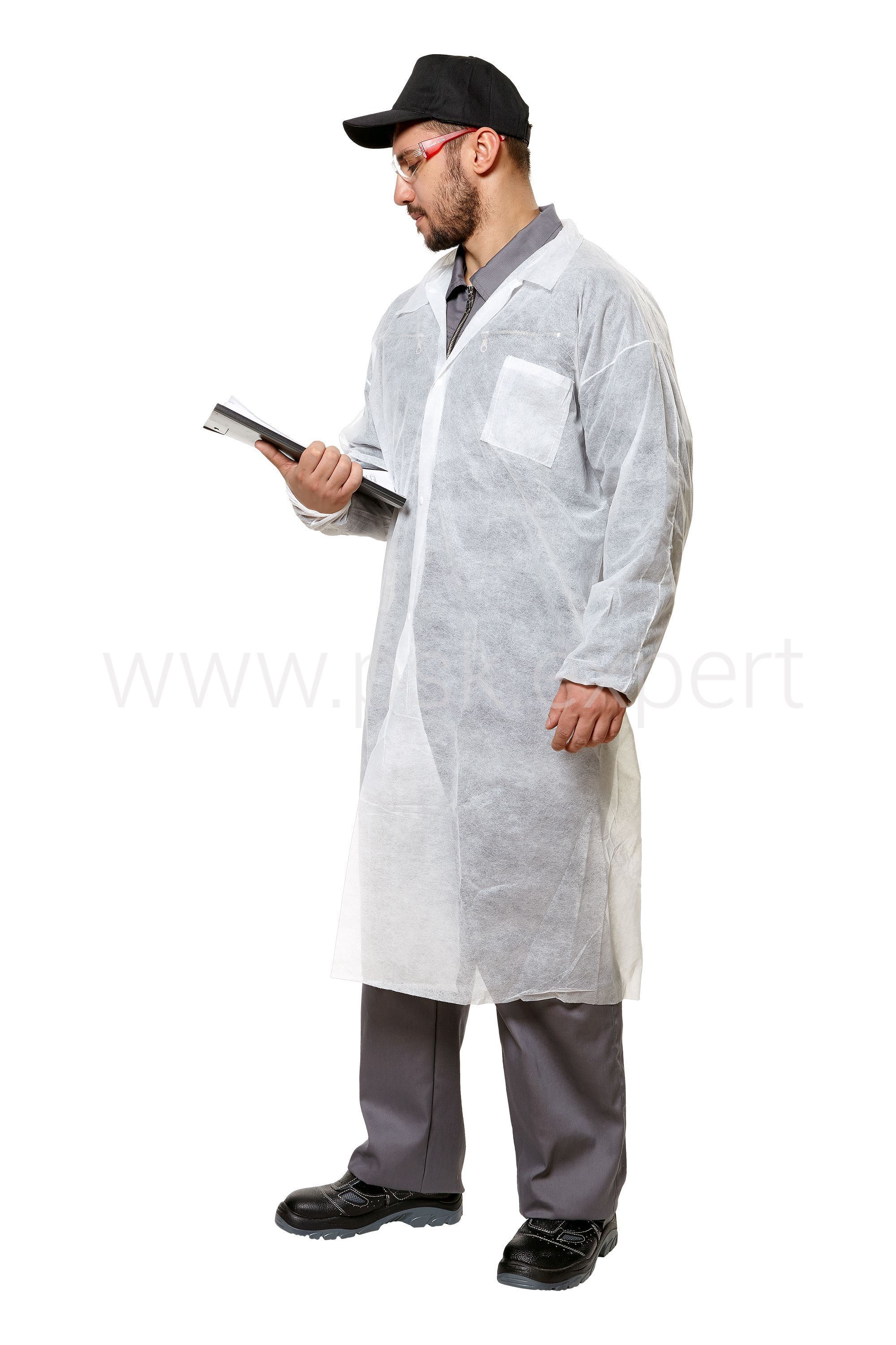 Халат одноразовый, имеет хорошую воздухопроницаемость одновременно с пылезащитными свойствами, застегивается на кнопки. Материал нетоксичен, не вызывает аллергических реакций, антистатичен. Разрешен к применению в медицине, фармацевтической и пищевой промышленности.