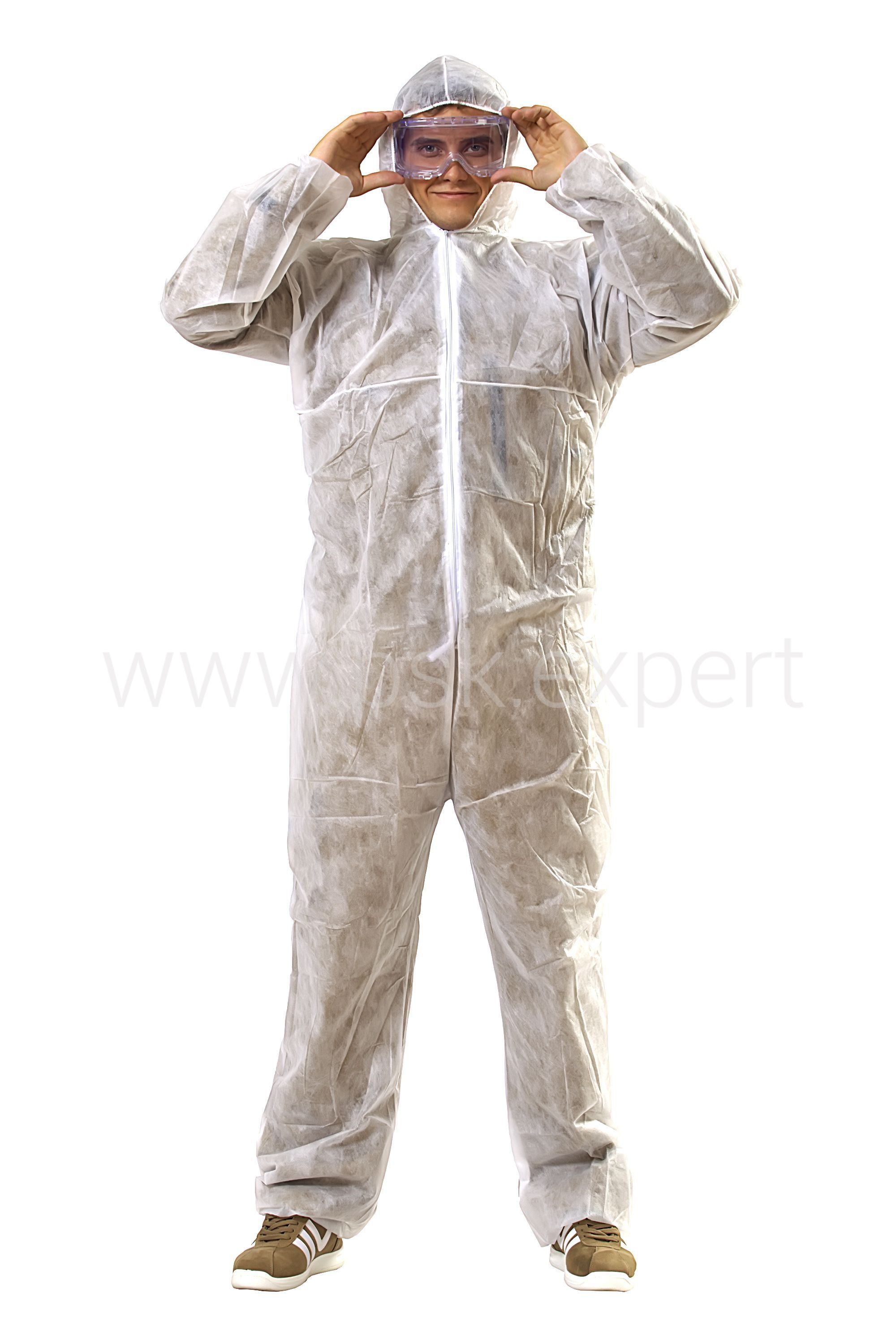 Комбинезон одноразовый изготовлен из нетканого безворсового материала «cпанбонд» плотностью 40 г/кв.м. Материал нетоксичен, не вызывает аллергических реакций, антистатичен, имеет хорошую воздухопроницаемость одновременно с пылезащитными свойствами. Центральная застежка на молнию. Разрешен к применению в медицине, фармацевтической и пищевой промышленности.