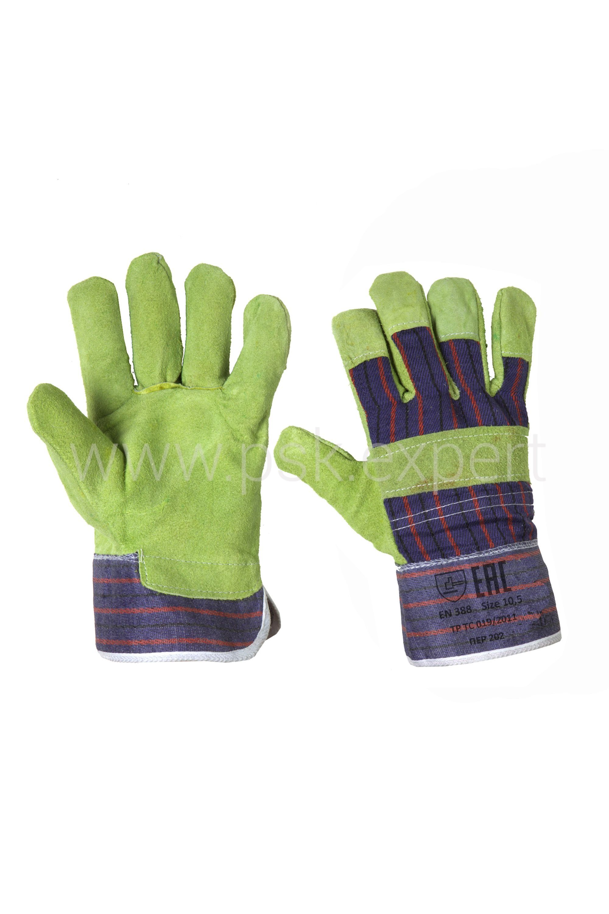 Перчатки выполнены из говяжьего кожевенного спилка (т.1,0-1,2мм) с вставками из плотного хлопка с рисунком полоска. Внутренний подклад из мягкого текстиля. Для удобства эксплуатации, в области запястья с тыльной стороны перчатки стянуты эластичной тесьмой. Манжет-крага сделан из хлопка, дополнительно усилен нетканным материалом. Перчатки отличаются эластичностью, имеют шероховатую поверхность и обеспечивает отличное сцепление с различными поверхностями. Спилок защищает от механических воздействий: устойчив к истиранию и разрыву. Перчатки имеют универсальное применение, рекомендуются для строительных, монтажных, погрузочно-разгрузочных и других видов работ.
