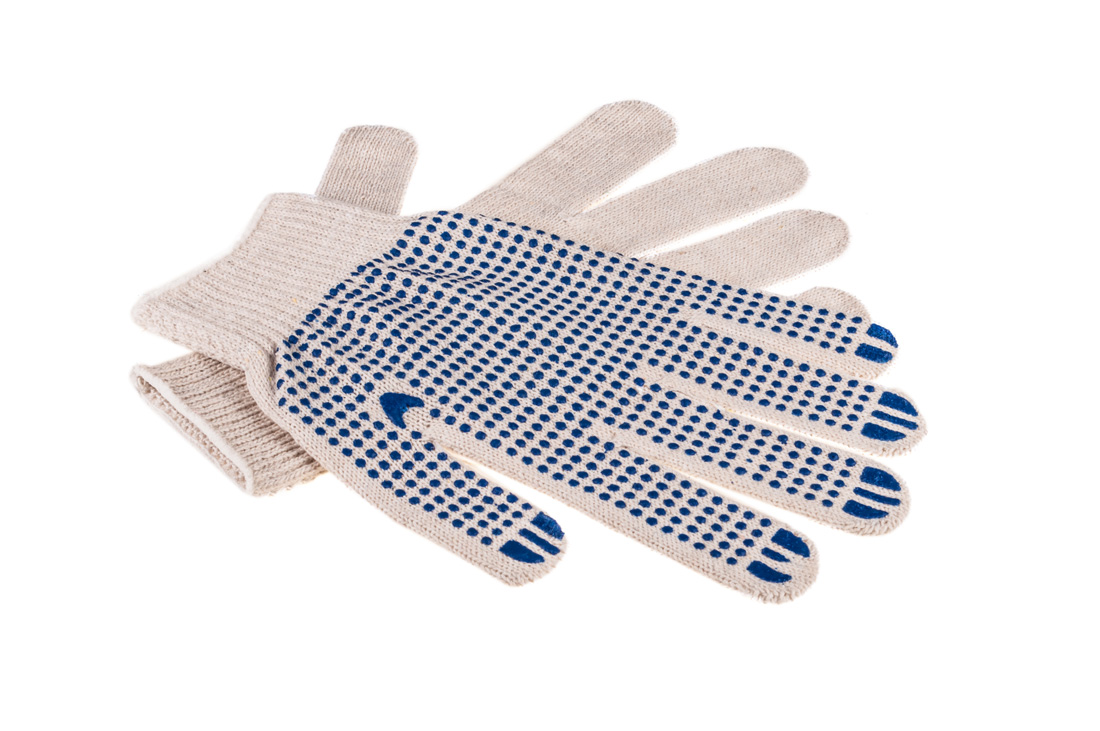изготовлены из натурального хлопка, а точечки на контактной поверхности из специального полимерного материала. Покрытие из ПВХ позволяет крепко удерживать в руках скользящие материалы, структура покрытия не позволяет предмету вылететь или выскользнуть из руки. Такие перчатки пригодятся не только рабочим, но и рыболовам, огородникам, и охотникам. Эти перчатки изготавливаются из 100% натуральной хлопковой нити, что позволяет полностью исключить аллергические реакции на искусственные материалы у рабочих, страдающих аллергией.