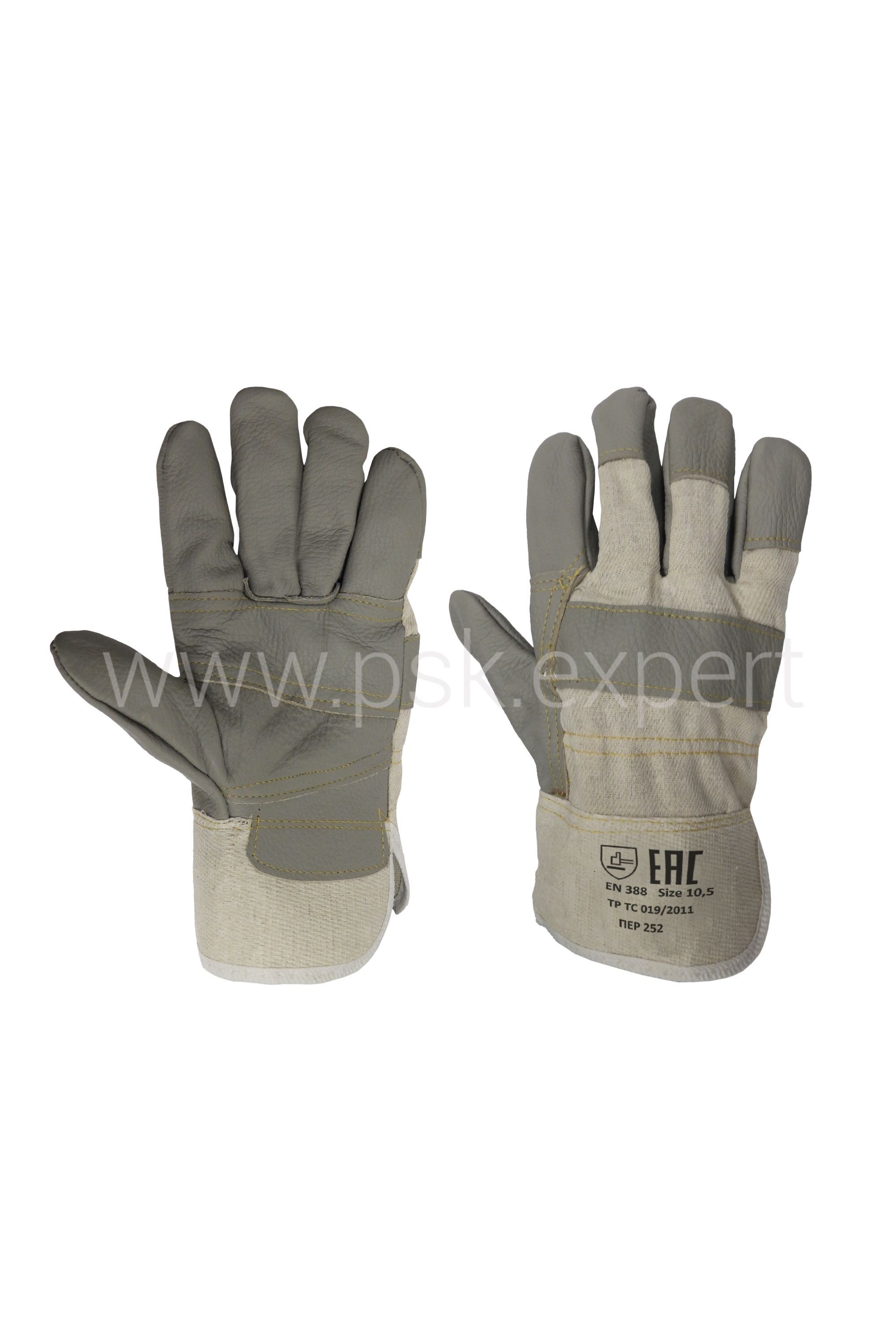 Перчатки выполнены из фурнитурной кожи (т.1,2-1,4мм) с вставками из плотного хлопка. Внутренний подклад из мягкого текстиля. Манжет-крага из хлопка. Фурнитурная кожа отличается повышенной прочностью, защищает от механических воздействий: устойчива к истиранию, разрыву, проколам и порезам. Использование натуральных материалов (кожа и хлопок) обеспечивает отличный воздухообмен, что делает комфортным работу в течении всего рабочего дня. Перчатки имеют универсальное применение, рекомендуются для строительных, монтажных, погрузочно-разгрузочных и других видов работ. Цвет фурнитурной кожи может быть серым или тёмно-коричневым.